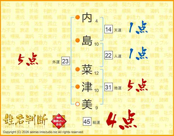 内(4画)島(10画) 菜(12画)津(10画)美(9画)