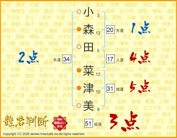 小(3画)森(12画)田(5画) 菜(12画)津(10画)美(9画)