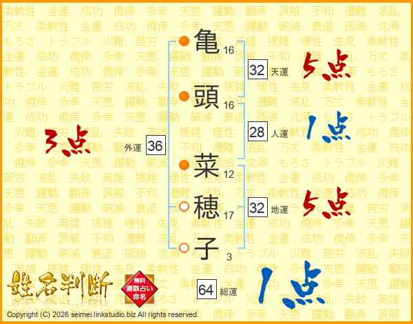 亀(16画)頭(16画) 菜(12画)穂(17画)子(3画)