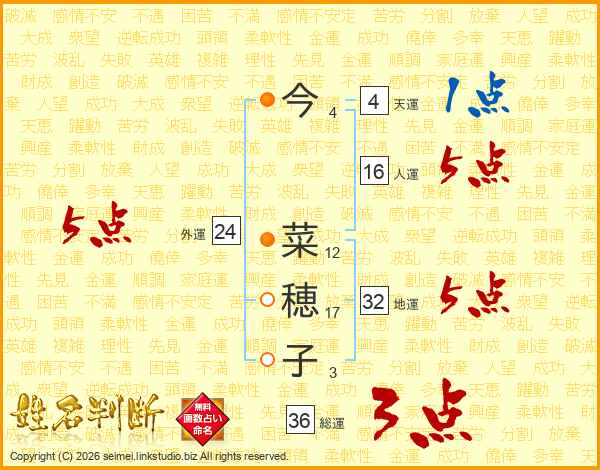 今(4画) 菜(12画)穂(17画)子(3画)