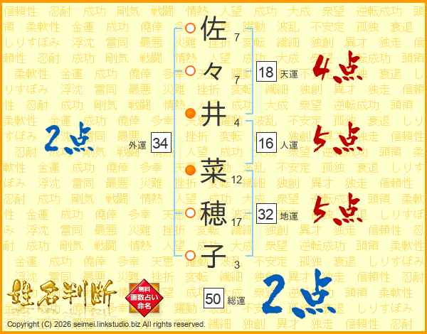 佐(7画)々(7画)井(4画) 菜(12画)穂(17画)子(3画)