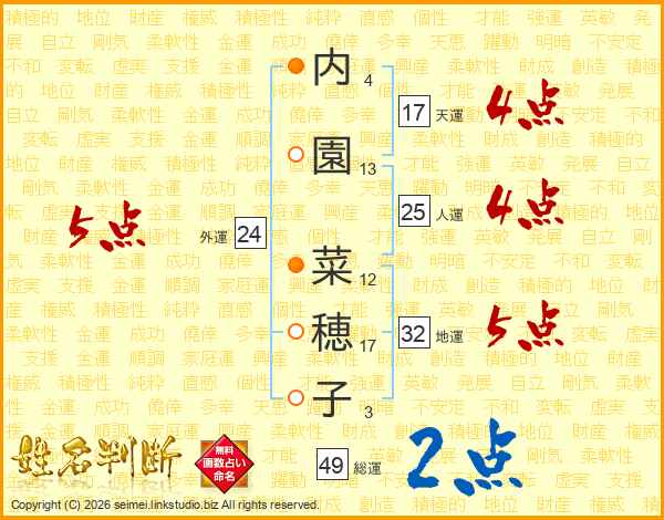 内(4画)園(13画) 菜(12画)穂(17画)子(3画)