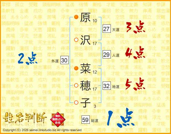 原(10画)沢(17画) 菜(12画)穂(17画)子(3画)