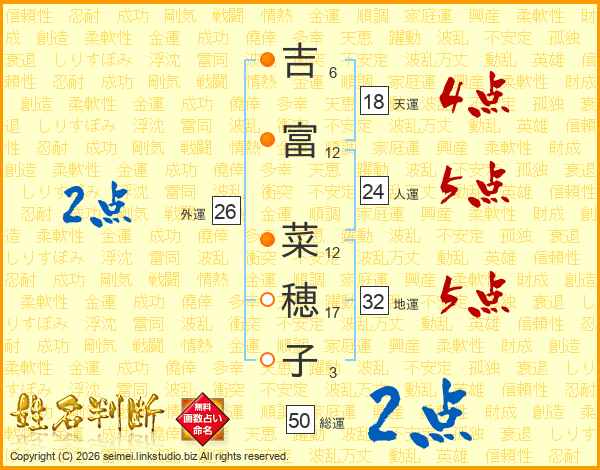 吉(6画)富(12画) 菜(12画)穂(17画)子(3画)