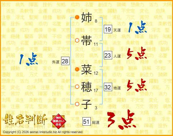 姉(8画)帯(11画) 菜(12画)穂(17画)子(3画)