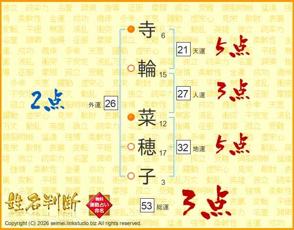 寺(6画)輪(15画) 菜(12画)穂(17画)子(3画)