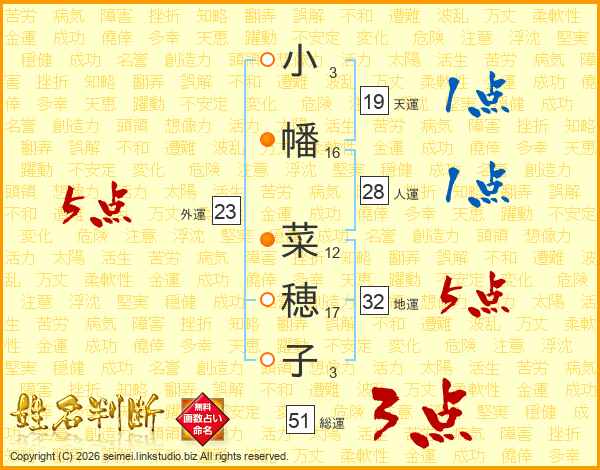 小(3画)幡(16画) 菜(12画)穂(17画)子(3画)