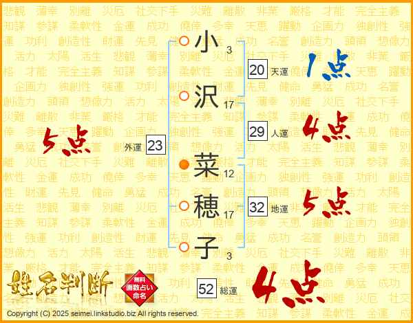 小沢菜穂子さんの総運は52画の4点!