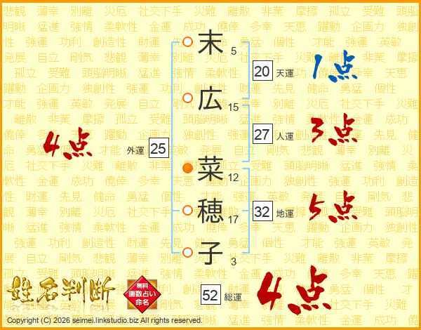 末(5画)広(15画) 菜(12画)穂(17画)子(3画)