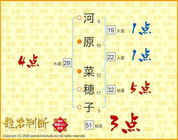 河原菜穂子さんの総運は51画の3点!