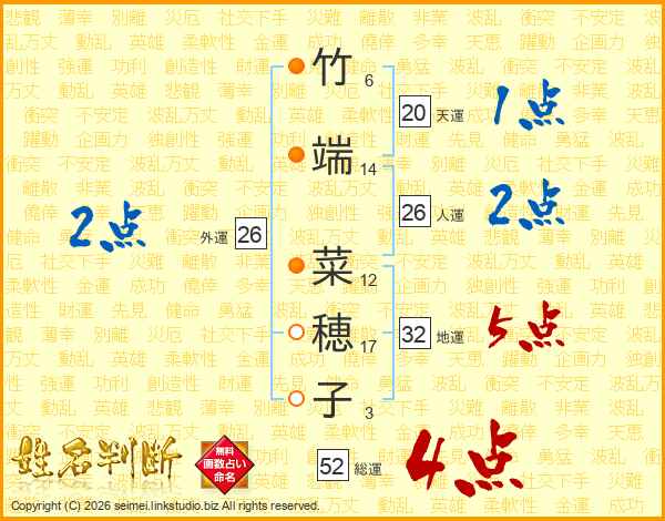 竹端菜穂子さんの総運は52画の4点!