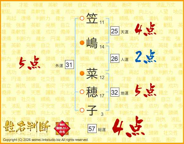 笠(11画)嶋(14画) 菜(12画)穂(17画)子(3画)