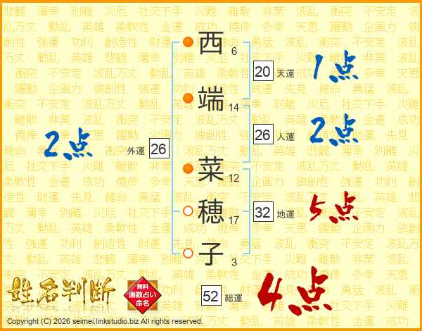 西(6画)端(14画) 菜(12画)穂(17画)子(3画)