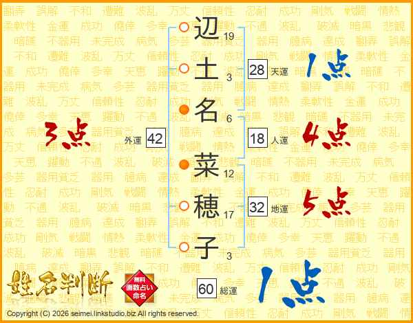 辺(19画)土(3画)名(6画) 菜(12画)穂(17画)子(3画)