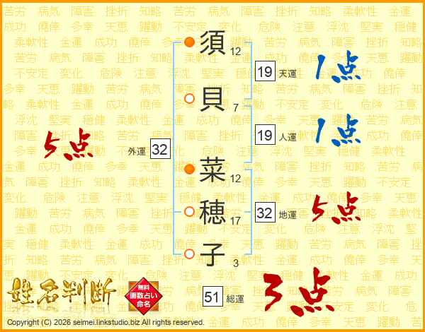 須(12画)貝(7画) 菜(12画)穂(17画)子(3画)