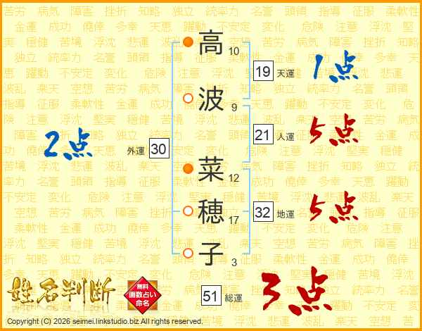 高(10画)波(9画) 菜(12画)穂(17画)子(3画)