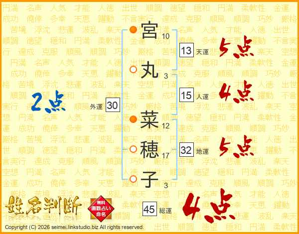 宮丸菜穂子さんの総運は45画の4点!