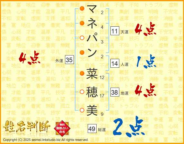 マ(2画)ネ(4画)パ(3画)ン(2画)  菜(12画)穂(17画)美(9画)