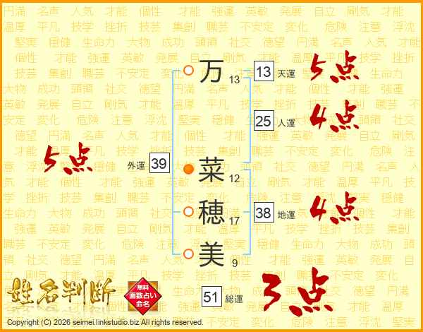 生活面を象徴する運勢です。外部から受ける影響力を表し、結婚運、家庭運や職場、環境への順応性を表します。総運から人運を引いた画数。姓や名が1文字の場合を除く。