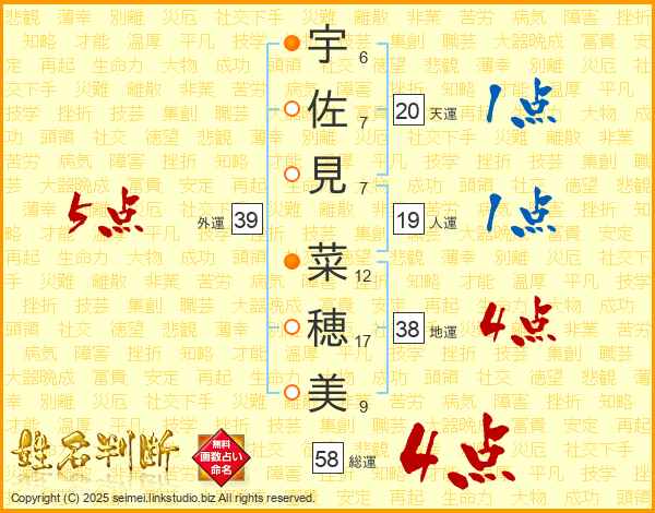 宇(6画)佐(7画)見(7画) 菜(12画)穂(17画)美(9画)