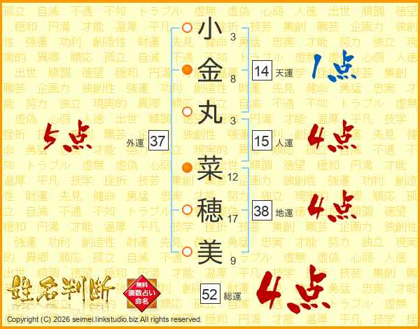 小(3画)金(8画)丸(3画) 菜(12画)穂(17画)美(9画)