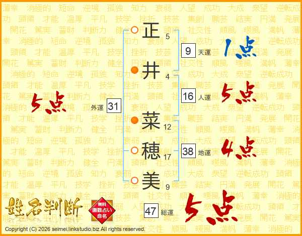 正(5画)井(4画) 菜(12画)穂(17画)美(9画)