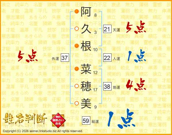 阿(8画)久(3画)根(10画) 菜(12画)穂(17画)美(9画)