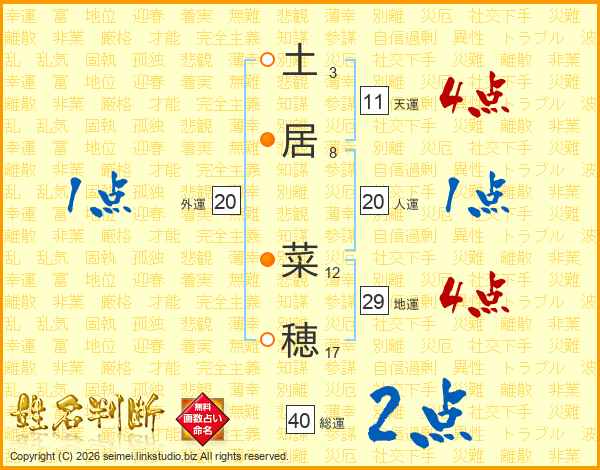 生活面を象徴する運勢です。外部から受ける影響力を表し、結婚運、家庭運や職場、環境への順応性を表します。総運から人運を引いた画数。姓や名が1文字の場合を除く。