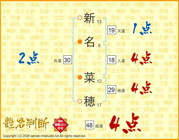 生活面を象徴する運勢です。外部から受ける影響力を表し、結婚運、家庭運や職場、環境への順応性を表します。総運から人運を引いた画数。姓や名が1文字の場合を除く。