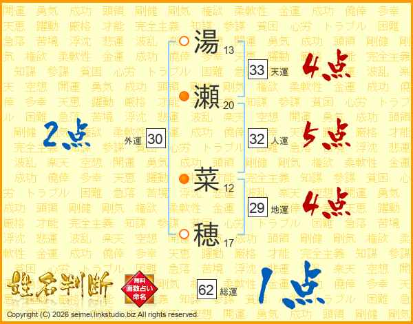 湯(13画)瀬(20画) 菜(12画)穂(17画)