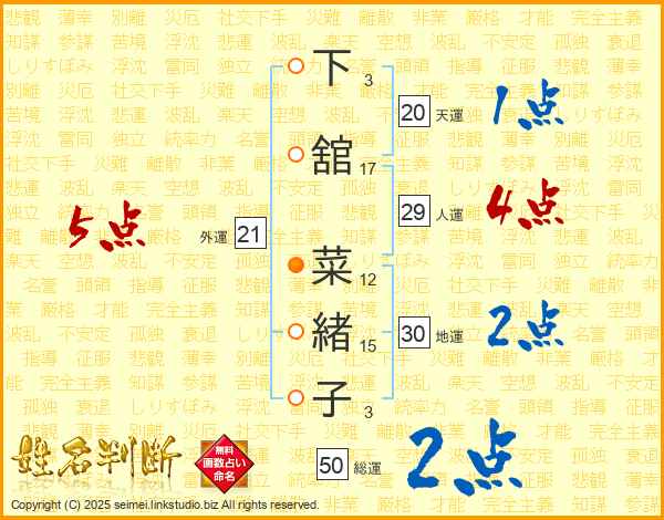 下(3画)舘(17画) 菜(12画)緒(15画)子(3画)