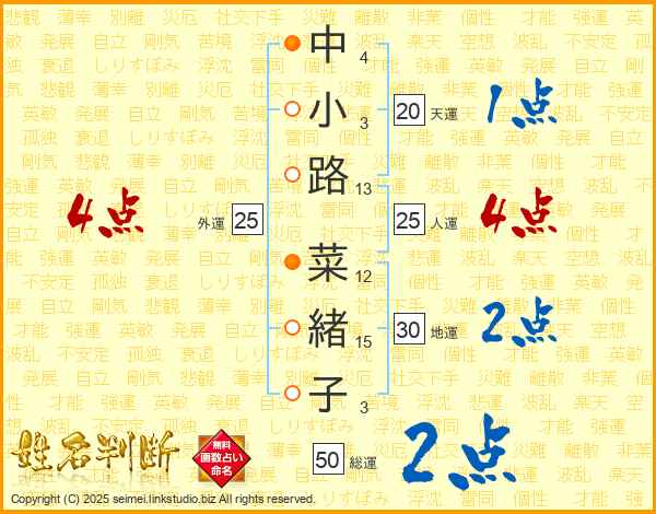 中(4画)小(3画)路(13画) 菜(12画)緒(15画)子(3画)