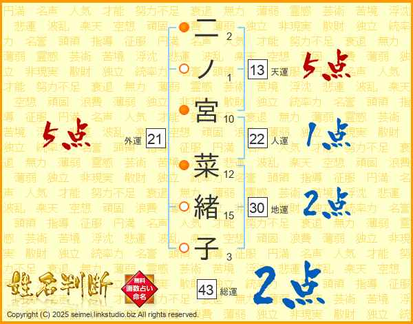 二(2画)ノ(1画)宮(10画) 菜(12画)緒(15画)子(3画)