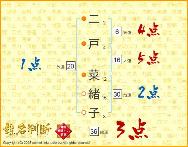 二(2画)戸(4画) 菜(12画)緒(15画)子(3画)
