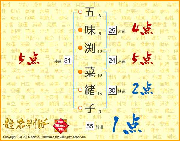 五味渕菜緒子さんの総運は55画の1点!