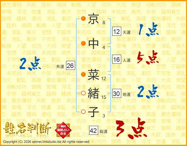 京(8画)中(4画) 菜(12画)緒(15画)子(3画)