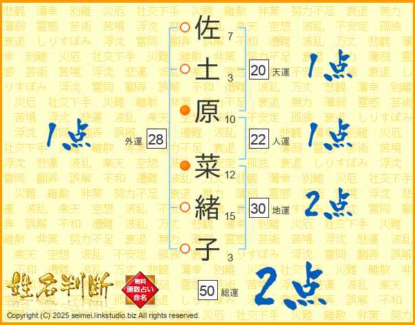 佐(7画)土(3画)原(10画) 菜(12画)緒(15画)子(3画)