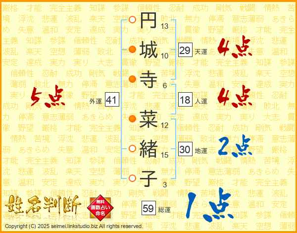 円(13画)城(10画)寺(6画) 菜(12画)緒(15画)子(3画)