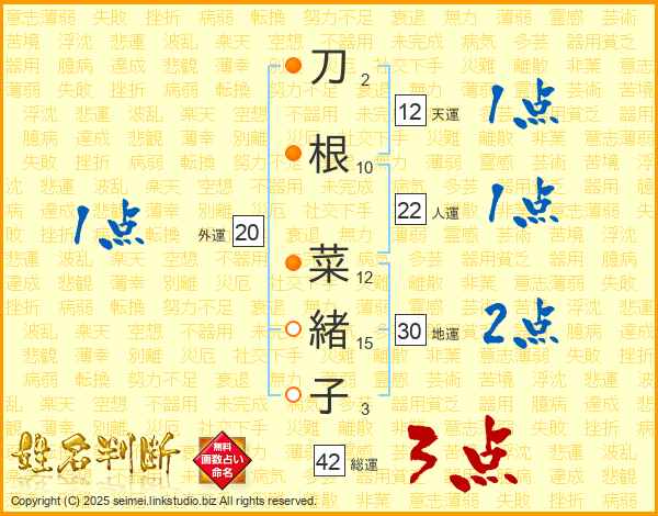 刀(2画)根(10画) 菜(12画)緒(15画)子(3画)
