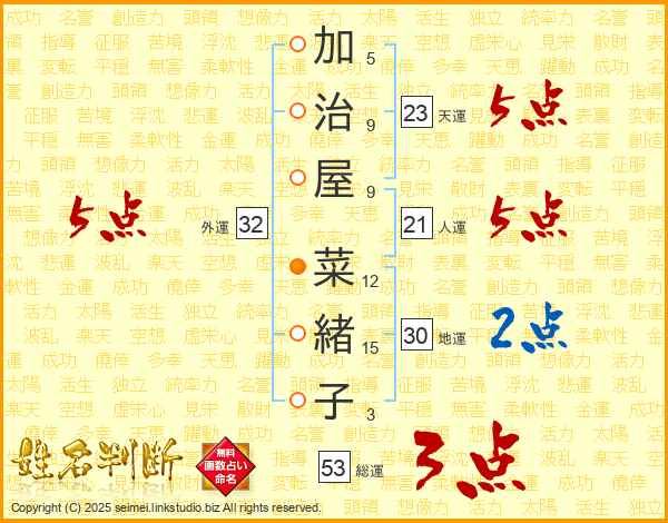 加(5画)治(9画)屋(9画) 菜(12画)緒(15画)子(3画)