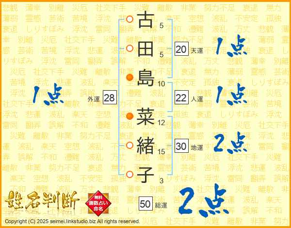 古(5画)田(5画)島(10画) 菜(12画)緒(15画)子(3画)