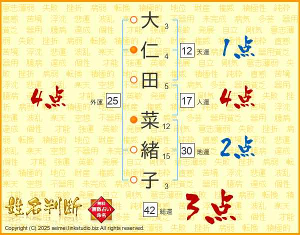 大(3画)仁(4画)田(5画) 菜(12画)緒(15画)子(3画)
