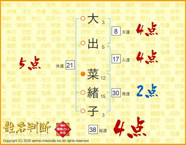 大(3画)出(5画) 菜(12画)緒(15画)子(3画)
