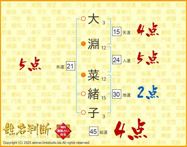 大(3画)淵(12画) 菜(12画)緒(15画)子(3画)