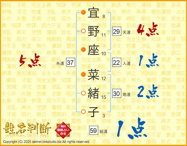 宜(8画)野(11画)座(10画) 菜(12画)緒(15画)子(3画)