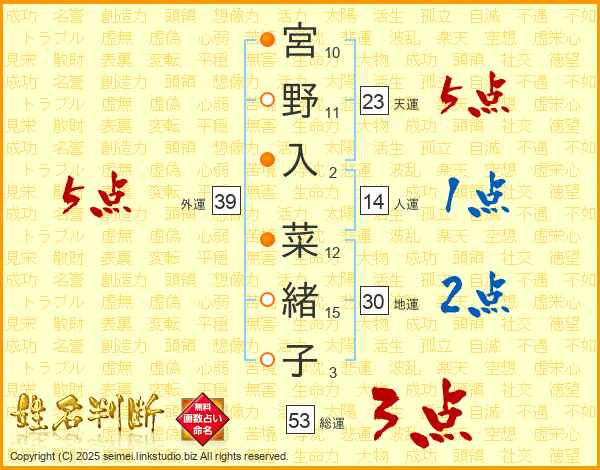 宮野入菜緒子さんの外運は39画の5点