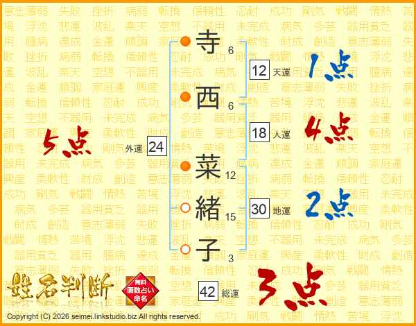 寺(6画)西(6画) 菜(12画)緒(15画)子(3画)