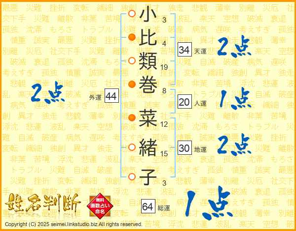 小(3画)比(4画)類(19画)巻(8画) 菜(12画)緒(15画)子(3画)