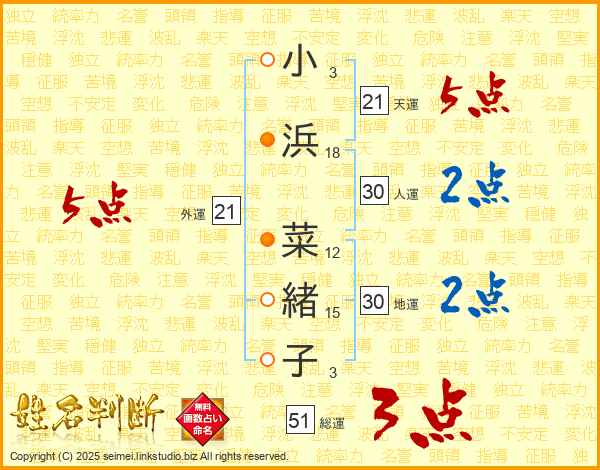 小(3画)浜(18画)  菜(12画)緒(15画)子(3画)