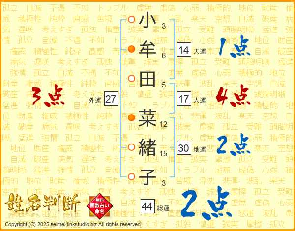 小(3画)牟(6画)田(5画) 菜(12画)緒(15画)子(3画)